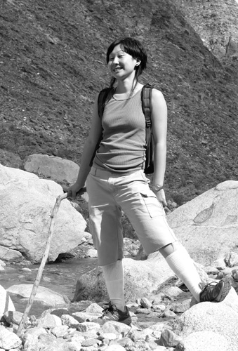 My mom and I went to Anza-Borrego State Park on 3/20/05. The weather forecast predicted rain, but it turned out to be a really nice day, and we even saw a jackrabbit and a borrego. Here I am on the Borrego Palm Canyon hike, getting a sunburn, with my cool walking stick and questionable hiking attire. (There actually was a point to my socks; last time I went I managed to rub up against something mildly poisonous and got a nasty rash on my legs. Also, my legs are completely covered in bruises at this point, and I didn't really think anyone wanted to see that.)