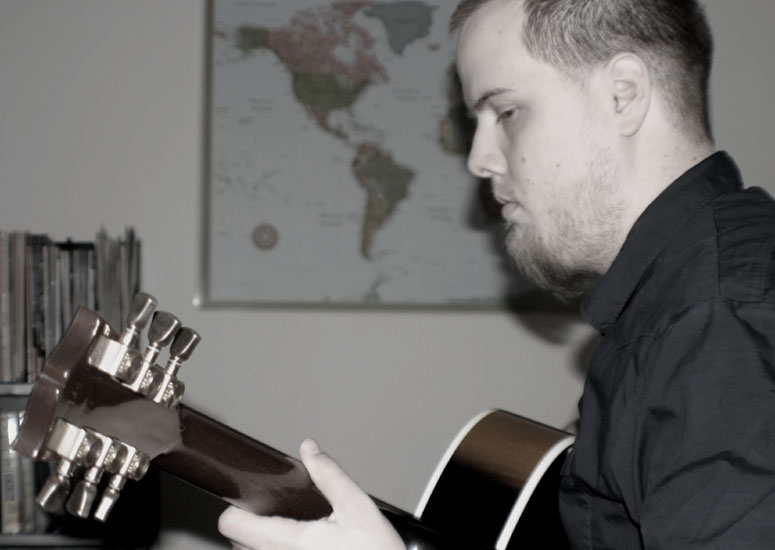 I have no good photos of Nick playing guitar at all so I tried to take some at home. Not that this one's particularly great, but I kinda like the color scheme; it looks like a black & white photo that's been hand painted.